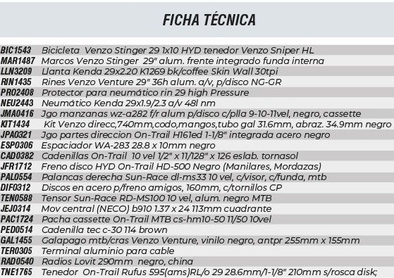 El sistema de frenos hidráulicos On Trail ON500 asegura una frenada precisa en cualquier situación. Con un casete On Trail 11/50 de 10 velocidades y tensor Sunrace, disfrutarás de una experiencia de conducción fluida. Además, la bicicleta cuenta con una garantía de 2 años sobre el marco, brindándote tranquilidad en cada aventura.