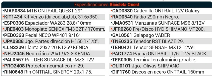 - Marco Ontrail Quest 29” alu. 6061 hidroformado PostMount (Interno). Monoplato, Frente Cónico.