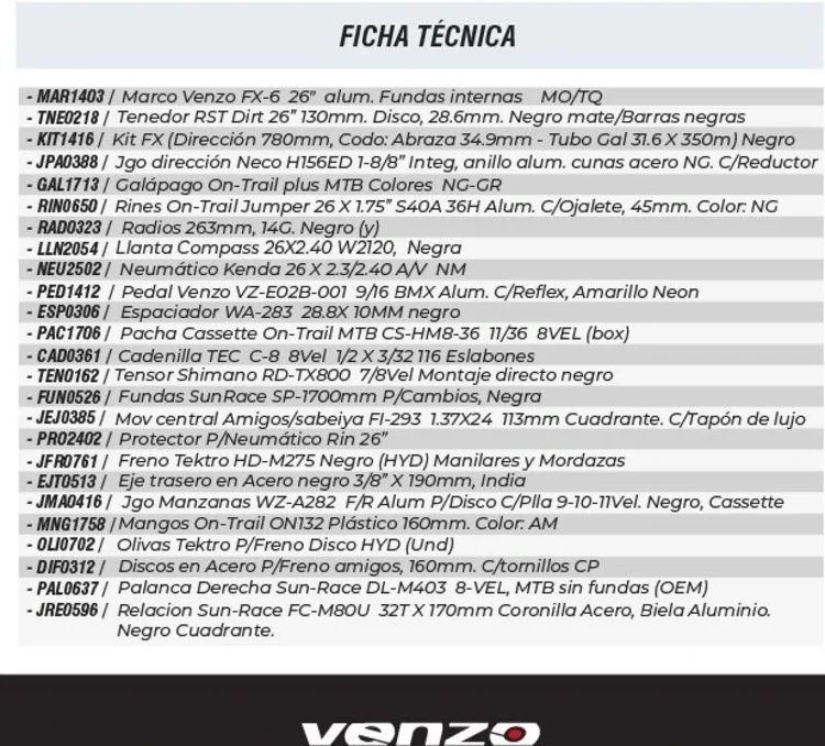 Los frenos hidráulicos Tektro HD-275 proporcionan una respuesta precisa y confiable, mientras que los pedales Venzo vz-e02b BMX en aluminio ofrecen resistencia y agarre. Disponible en tallas 13″ y 14″, esta bicicleta es perfecta para quienes buscan construir una experiencia personalizada en cada aventura.
